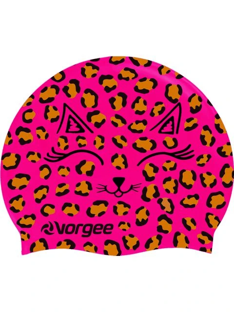 The Vorgee Swim Cap – Kitty features an orange and black leopard print design with a cute cat face on a pink base.