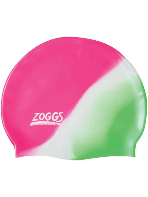 The Zoggs Junior Multicolour Silicone Swim Cap – Pink/White/Green has been shaped for a superior fit.